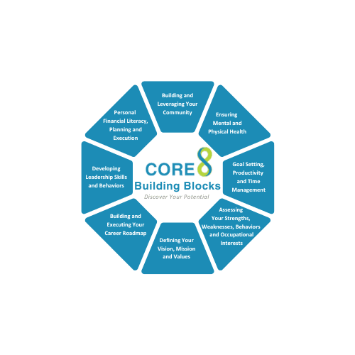 Your growth isn't random—it's built on a foundation. At Core8 Catalyst, we've identified the eight essential areas every young professional must develop to thrive in their career, finances, and life. Each building block is backed by actionable education, coaching, and community support designed to help you build clarity, confidence, and momentum.